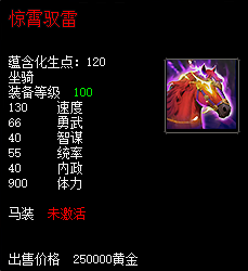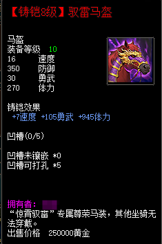 驭雷马盔 | 红色 | 速度16,防御360,勇武30,体力270 | 10 |