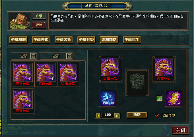 2.龙驹铸铠:在【马厩】处点击【龙驹铸铠】进入铸铠面板,玩家可使用铸铠精铁对同一部位的2件品质相同的马装进行铸铠。当马装铸铠到一定等级时需要消耗高级铸铁精铠。无论铸铠成功与否,每次都将消耗一个对应道具。铸铠时可使用铸铠保护符对马装进行保护,防止铸铠失败时马装破损消失。