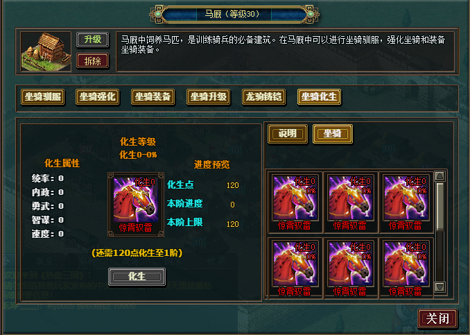 3.君主坐骑化生:玩家可在【马厩】中选择【坐骑化生】对君主坐骑进行化生。目前仅惊霄驭雷可进行化生。当已强化的君主坐骑作为材料进行填充时,强化等级将不继承至化生的主坐骑。请玩家在强化时注意主坐骑的选择。