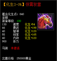 君主坐骑化生成功后将额外获得一些属性,例如速度、勇武、智谋等。下图为化生3的惊霄驭雷属性,可供玩家参考: