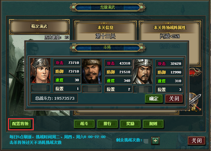 3)将领配置:点击【将领配置】进入配置页面进行将领配置。君主将必须参与战斗。