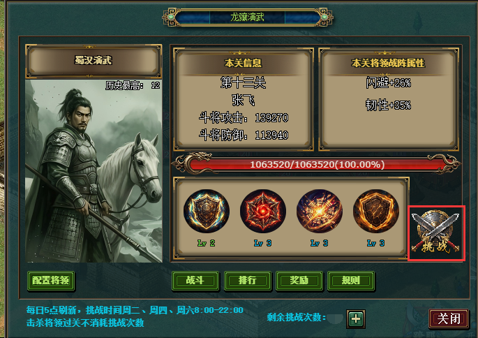 5)挑战及挑战次数:点击界面中的【挑战】按钮即可进行挑战。若当前挑战成功,本次挑战将不消耗挑战次数。演武开放日当天系统将免费提供5次挑战次数。玩家可通过元宝购买额外增加挑战次数。首次购买的金额为10元宝,演武开放日当天最多可购买10次挑战次数。挑战次数仅当日有效。